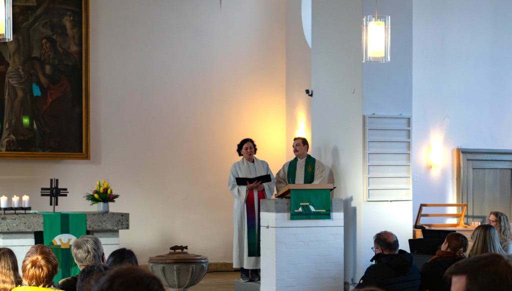 Bild 2: Diakonin Marion Schönsteiner und Diakon Jakob Wank bei ihrer Predigt im Gottesdienst